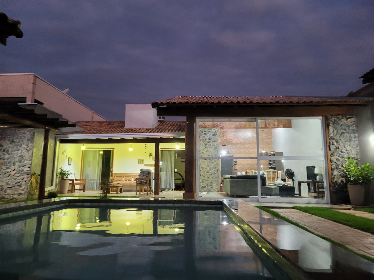 Casa da Amora Super šarmantna kuća, nalazi se u Tarumã Condominium, u Bonito MS. Ima 1 apartman i 2 spavaće sobe; Klimatizovana TV soba sa veoma udobnim kaučem na razvlačenje; Veoma dobro opremljena kuhinja, sa dobrim aparatima i posuđem; Gurmanski prostor sa roštiljem, šporetom, pivarom; Predivan prostor u dvorištu sa bazenom, terasom sa baštenskim nameštajem i parkingom. Može da primi 7 osoba u krevetima, a 3 u dnevnoj sobi na kauču i dušeku. Više od 10 osoba (100,00) i moraju da ponesu svoje dodatne dušeke