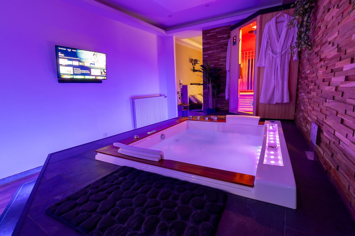 Dobro došli u privatni spa centar XELA Bićete u potpuno opremljenom prostoru za vaše fizičko blagostanje. • Udoban dnevni boravak sa električnim kaminom, televizorom i dvije fotelje za opuštanje. • Bioskopska soba sa bračnim krevetom i ogromnim filmskim ekranom, klima-uređaj. • Prostor za đakuzi (balneoterapiju), infracrvena sauna i tropski tuš. • Putni krevetac i stolica za hranjenje dostupni su na zahtev. Prijava: od 16:00, 100% nezavisno. Odjava: Odlasci prije 11:00.