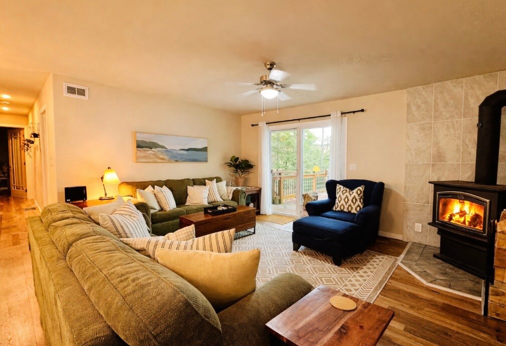 Escape to The Timber Oasis. A custom-built timber-frame retreat with floor-to-ceiling windows on 4 private acres of valley views. The Highlights: 🌲 5 mins to Lake Clear 🛁 Private covered Jacuzzi® Hot Tub 🔥 Cozy wood stove + outdoor fire pit 🛌 Sleeps 6: 2 BRs w/ Queen-over-Queen bunks 🐾 Pet Friendly 🛜 100+ Mbps WiFi Enjoy a gourmet kitchen, in-floor heat, and a massive deck. Perfect for families, friends, or a quiet workation. Handcrafted luxury meets nature. Book your stay!