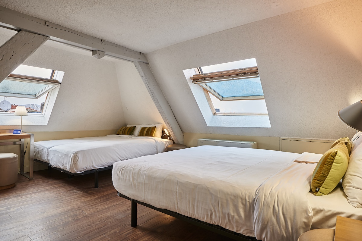 The family room can accommodate up to 3 people with 1 large double bed and 1 single bed. It includes a private bathroom with a shower and free organic toiletries. The room is equipped with air conditioning, heating, and a flat-screen TV. For essential comfort, it features high-quality bedding from the French brand Merinos and a plush duvet.