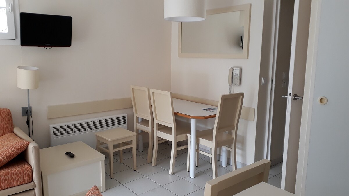 Ce studio de 25 m2 au 4eme et dernier étage idéalement situé au centre ville et à quelques mètres des plages tout en étant au calme. Le bien dispose d’un parking souterrain sécurisé , d’une cuisine toute équipée. Il se compose d'une entrée avec lit superposé et d'un lit deux place au salon ainsi qu’une terrasse. Le bien a également la wifi et lave linge .Si vous ne voulez pas faire le ménage (comme indiqué dans le règlement) vous pouvez opter pour l’option ménage à 50€ (uniquement sur demande)