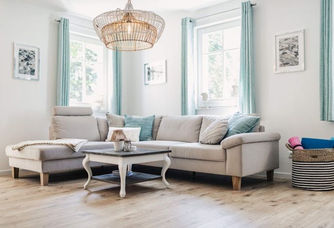 Unter unserem Reetdach haben Sie den Bodden im Blick – die 70 qm große Wohnung teilt sich in zwei Schlafzimmer und einen sehr großzügigen Wohn- und Essbereich auf. Hinzu kommt ein Badezimmer mit Dusche, Toilette und kuschliger Eckbadewanne. Im Wohnbereich mit Sofas und Sessel sorgt der Kamin in stürmischen Zeiten für wohlige Wärme. Die voll ausgestattete Küche lädt zu geselligen Kochabenden ein.