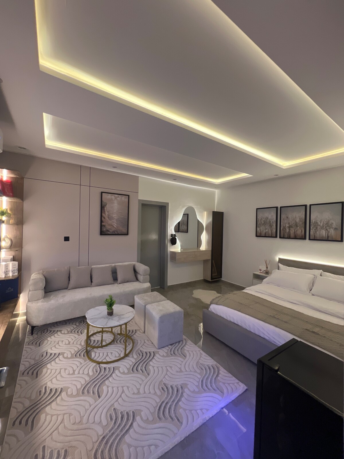 Uživajte u otmjenom boravku u modernom stanu koji se nalazi u srcu Hittina, jedne od najboljih četvrti Rijada. Stan je pažljivo namješten za maksimalnu udobnost, sa elegantnim namještajem i savremenim detaljima. 📍 Lokacija: Nekoliko minuta od Bulevara Rijada, Sportskog bulevara, Kraljevske arene, vrhunskih tržnih centara i finih restorana. ✨ Karakteristike: • Moderan, udoban dizajn • Kvalitetan krevet i posteljina • Smart TV i besplatan Wi-Fi • Potpuno opremljena kuhinja • Samostalna prijava • besplatan parking