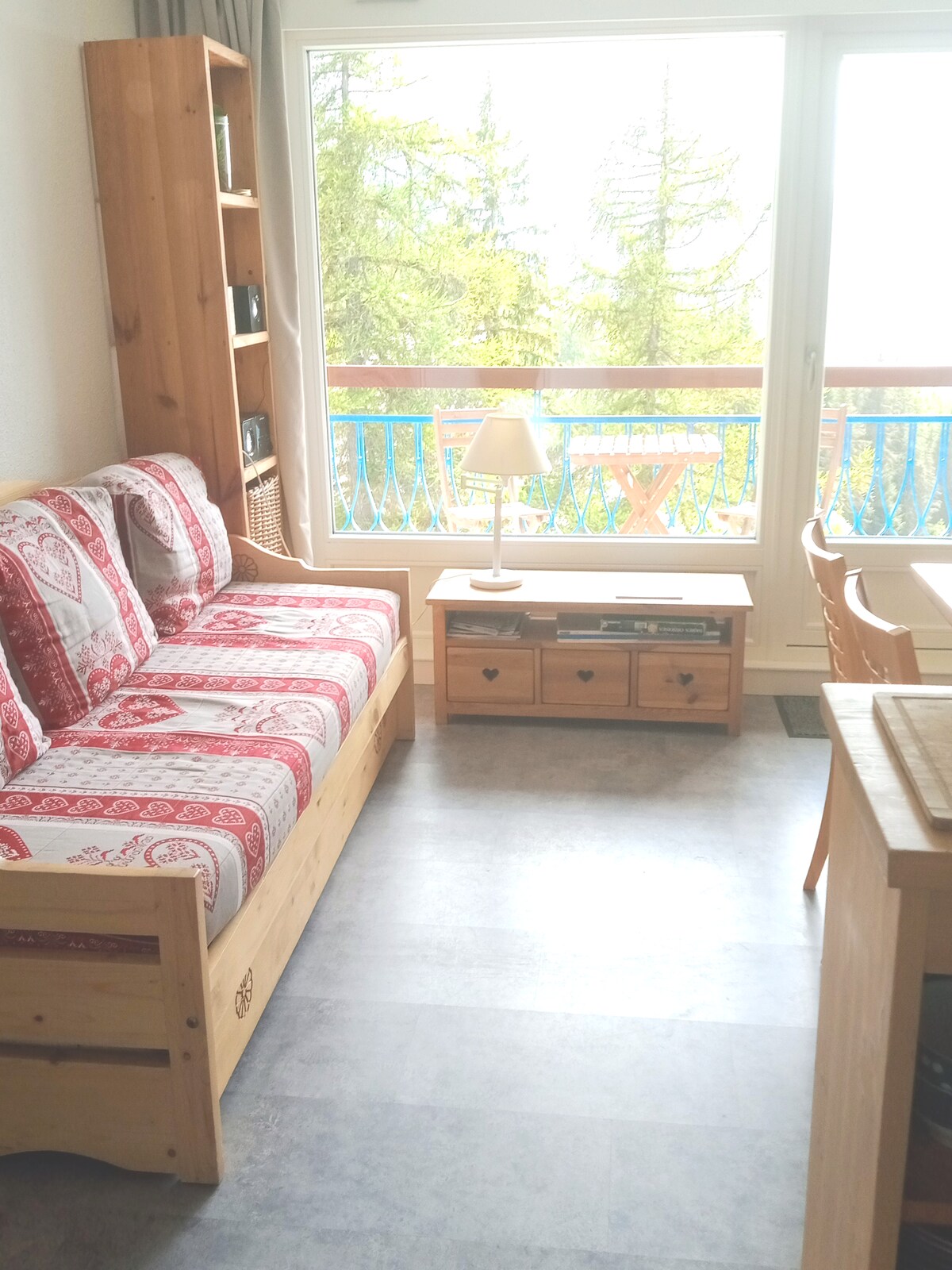 Our bright SW facing two bedroom apartment (57m2) is located in Sources de Marie at the quietest and most tranquil end of the village. It offers fantastic views over the Transarc Mountains and has a huge (15m2), SW facing corner balcony. There is free access to a jacuzzi, sauna and an outside pool. The Deep Nature Spa is located within the residence. Genuinely ski in ski out and close to the centre of the village, ski school, restaurants and bars.