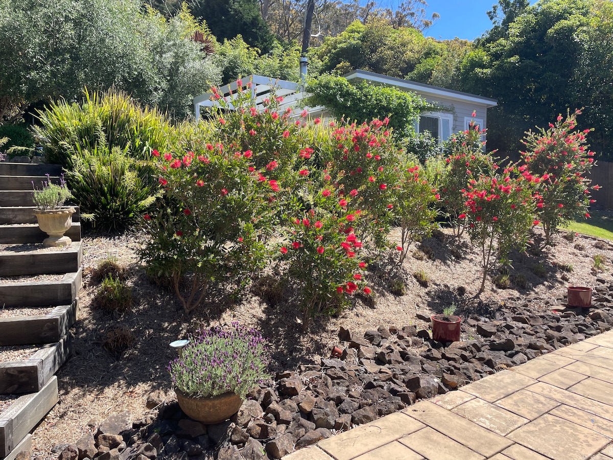 Newly refurbished studio set in our lovely tiered private garden on the slope of Mt Alexander. Views to the Mittagong Ranges and a very quiet and peaceful location. Easy 15 min walk to many food and drink venues. A/C (heat/cool), wood burner, ceiling fan, double glazed windows. Queen bed, bathroom with heated floor, heated towel rail and a well equipped kitchenette with basic breakfast provisions including tea and coffee. Private, peaceful & perfect for couples.