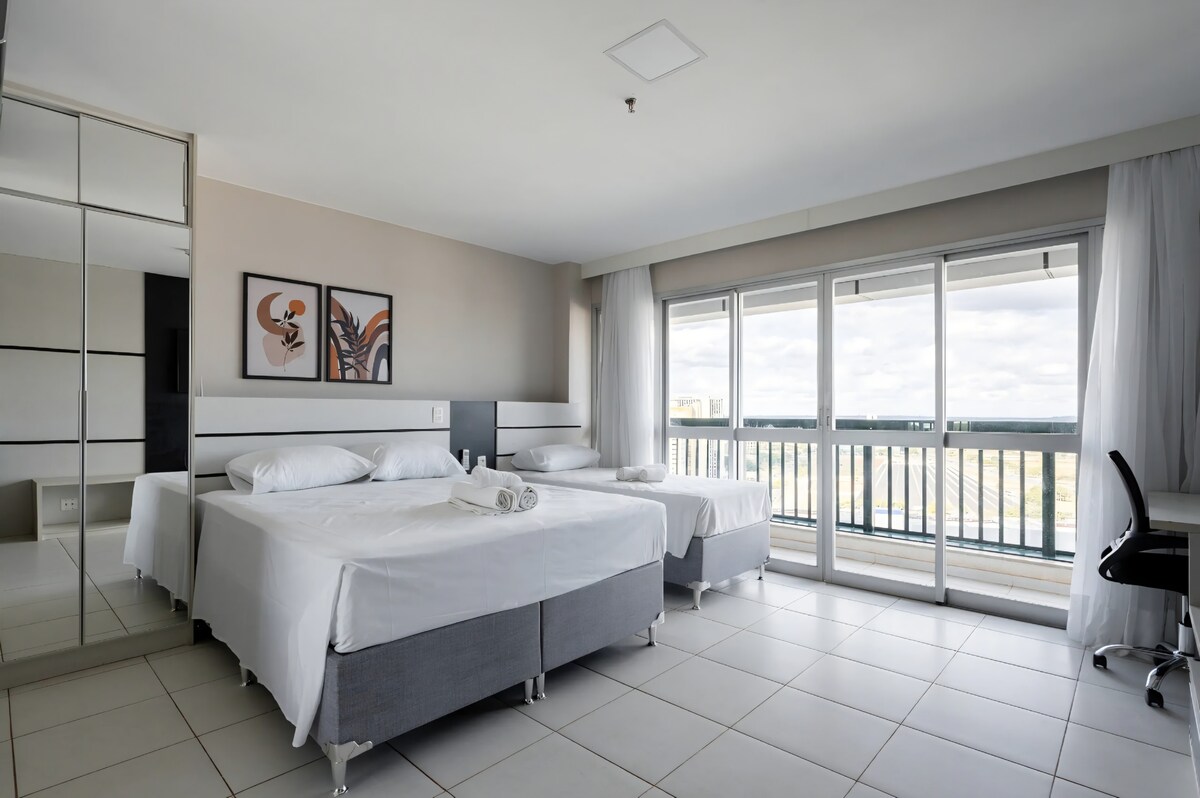 Stan sa jedinstvenim pogledom na Braziliju, Esplanadu, ministarstva i Kongres. Prelep izlazak sunca na našem balkonu. Prostrano, moderno i kompletno. Sve što vam treba biće vam na raspolaganju. Kompletan prostor za slobodno vreme sa bazenom, saunom i teretanom. Besplatan parking. Doručak nije uključen u cenu, ali je dostupan u zgradi. Povlašćena lokacija, u srcu Brazilije. Prostor za rad. Udobnost, praktičnost i bezbednost. Samostalna prijava i odjava radi lakšeg snalaženja.