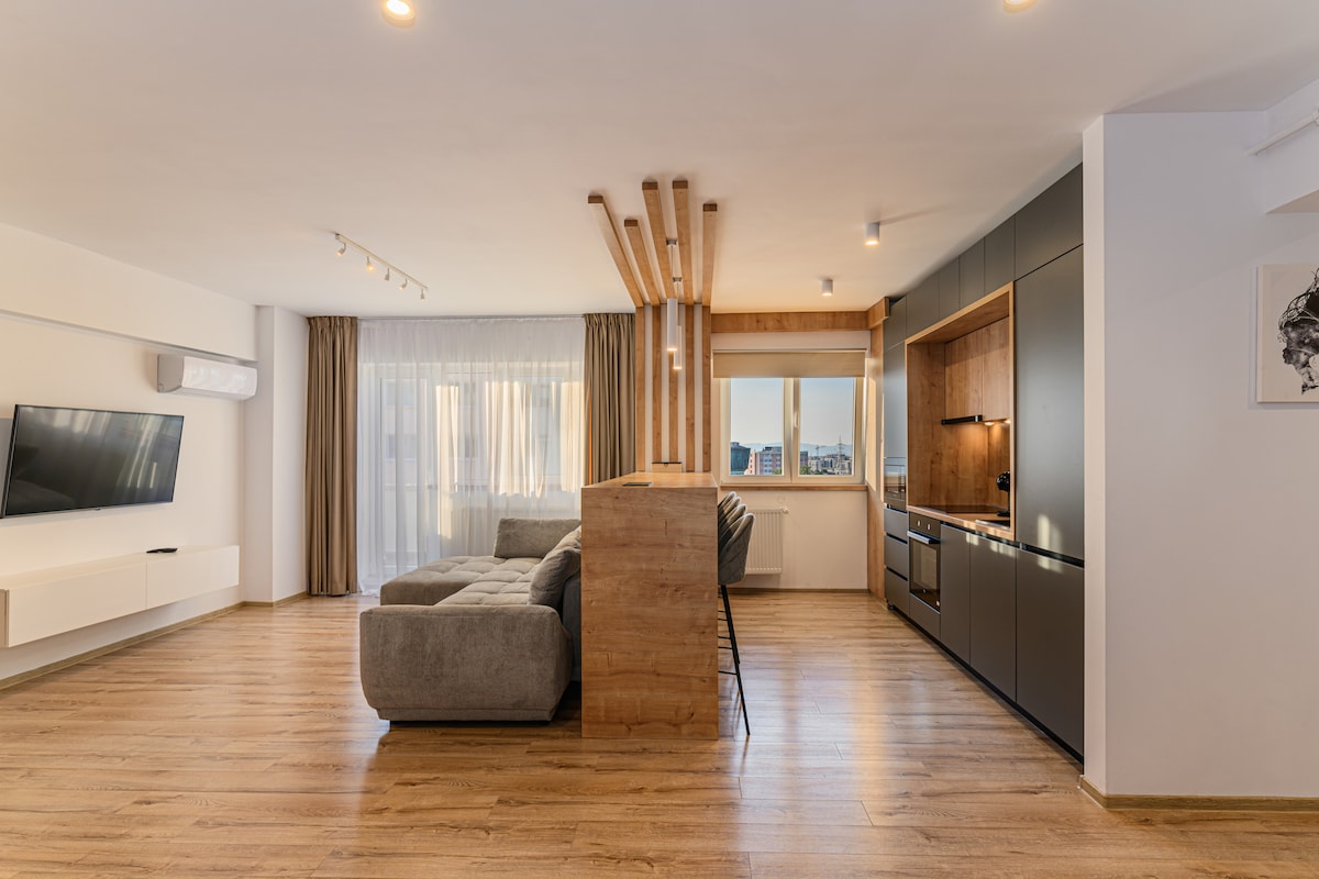 Probudite se uz predivan pogled na Karpatske planine sa privatnog balkona! Alpine Escape Studio sa pogledom na planine spaja udobnost, stil i praktičnost, na samo 5 minuta od centra Brašova. Savršeno za svečane šetnje na božićnoj pijaci, vikende na skijanju, letnje šetnje ili miran odmor sa poslom sa bilo kog mesta. Udoban, moderan i spreman za vaš zimski odmor!