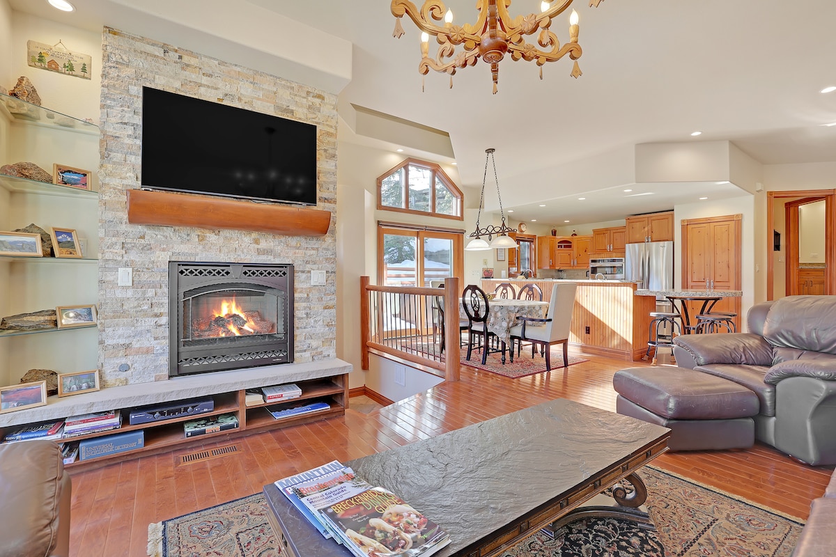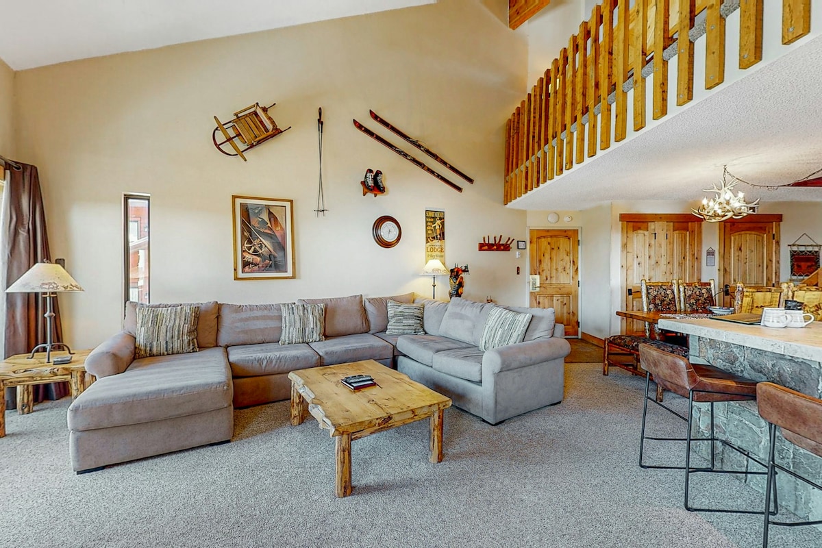 Dobro došli u svoj planinski odmor iz snova! Ovaj renovirani penthaus uz skijašku stazu udaljen je nekoliko koraka od žičare Quicksilver i glavne ulice. Za 10 osoba, 3 kreveta, 2 kupatila, 2 balkona, pogled na planine, obilje prirodne noći (i zavjese za zamračivanje u svakoj sobi). Uživajte u potpuno opremljenoj kuhinji, kaminu na drva, brzom Wi-Fi-ju, 4K televizorima i pogodnostima odmarališta: grijanom bazenu, hidromasažnoj kadi, sauni, teretani, igraonici, recepciji/konsijeržu, parkingu za skijanje i još mnogo toga. Parking u garaži je dostupan uz naknadu.