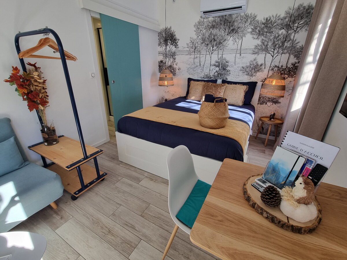 Usred crnike i morskih borova, novi studio od 25 m2 sa mezaninom. Daleko od buke i buke, 5 minuta biciklom od okeana i 5 minuta od prodavnica, prepustite se cvrkutu ptica i okeana. Imate terasu od 12 m2 i potpuno nezavisan ulaz. Studio uključuje mezaninsku spavaću sobu u potkrovlju, malu dnevnu sobu, opremljenu kuhinju i odvojeno WC kupatilo. PAŽNJA: plafon u kuhinji i kupatilo je udaljen 1,90 m.