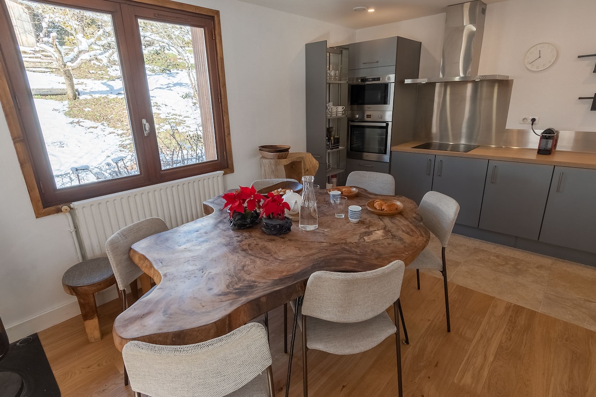 Perfect location for Telecabine and centre of the village. Quiet location. A rustic building restored and updated to afford a cosy atmosphere ideal for 2 or 3 families or a group of friends. Large kitchen/diner/snug is the best feature. Large dining table and feature glass fronted log burner. Well equipped kitchen. Effective central heating with temperature control to each room. 3 x Shower rooms with toilet 1 x Bathroom toilet & shower. Heated Boot Room/Ski locker.