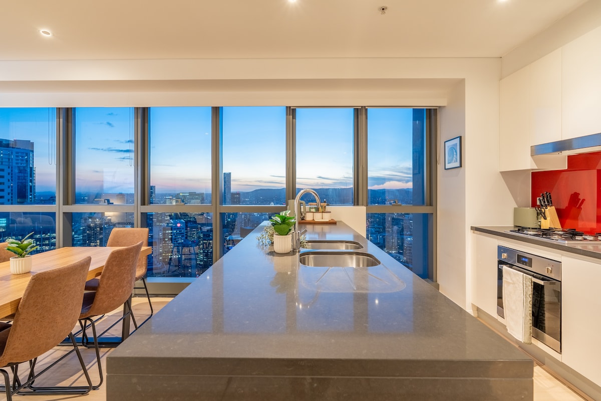 Pronađite svoj mir u ovom smeštaju sa 1 spavaćom sobom, koji je ocenjen dijamantom, na 59. spratu zgrade Kvinz Vorf. Uživajte u prelepom pogledu na reku i grad, električnom prozoru koji se lako otvara, modernom enterijeru i brzom Wi-Fi mrežom – svega nekoliko koraka od Južne obale, Botaničke bašte i najboljih restorana u Brizbejnu. Idealno za parove, korporacije i vikend-putovanja. ✔ Bez dodatne naknade za čišćenje ✔ Spavaća soba sa bračnim krevetom i kauč na razvlačenje (za 4 osobe) ✔ Kompletna kuhinja i otvoreni dnevni boravak ✔ Unutrašnji električni prozor za balkon ✔ Smart TV i Wi-Fi ✔ Bazen, teretana, sauna i restorani Saznajte više u nastavku 👇