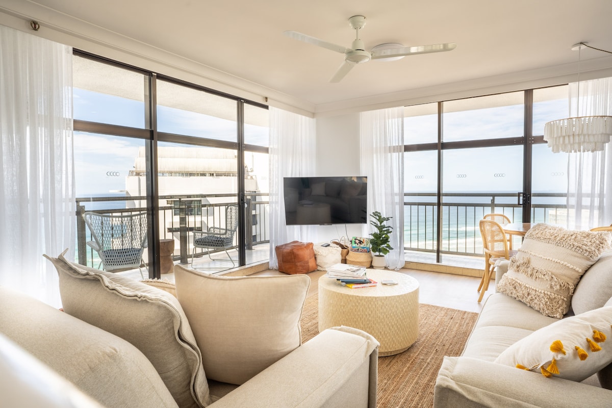 Apartman na plaži koji se nalazi na visokom spratu sa prozorima od poda do plafona, privatnim balkonom sa pogledom na okean i pristupom plaži Surfers Paradise koja je odmah preko puta. Stan ima bračni krevet u spavaćoj sobi i kauč na razvlačenje u dnevnom boravku. Potpuno opremljena kuhinja, brzi Wi-Fi, klima-uređaj, televizori sa Netflix-om i YouTube-om, besplatan parking i kompletna privatna praonica veša. Gosti imaju pristup teretani, spa centru, sauni, bazenu i roštiljima u blizini bazena i na krovnoj terasi.
