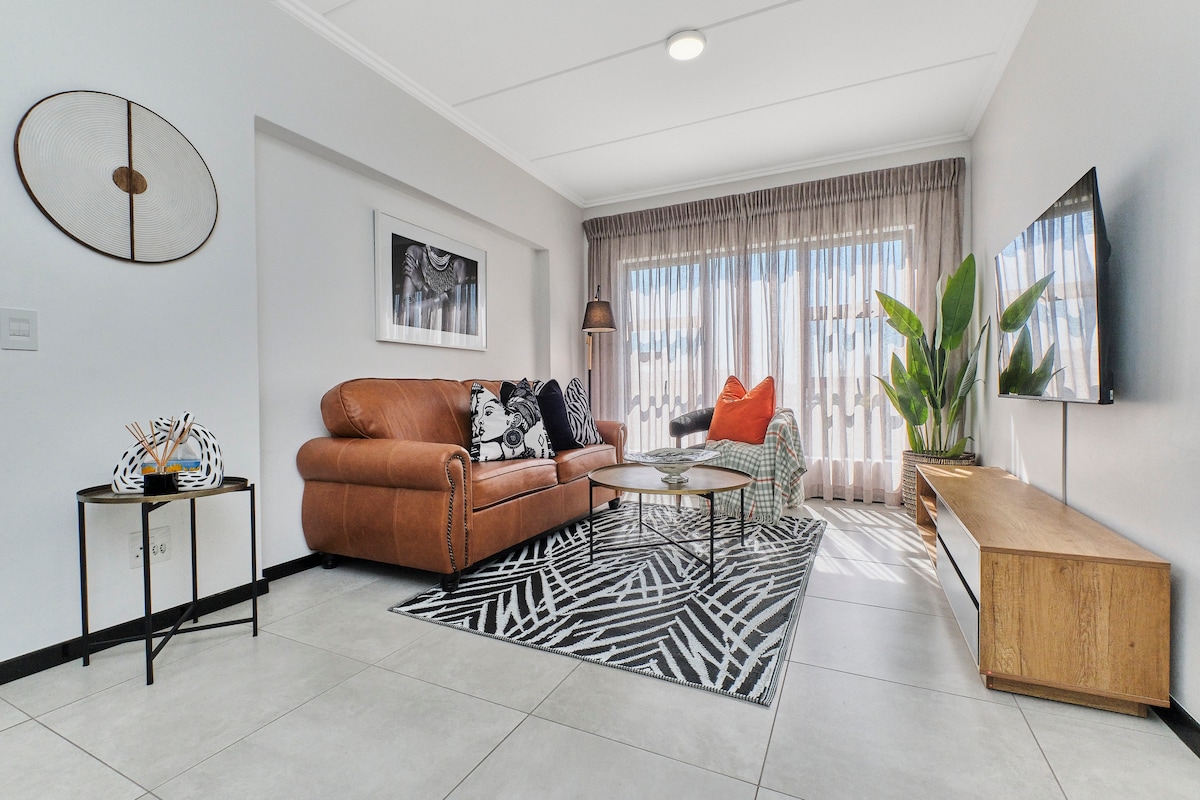 Modern centrally located in Bryanston. Two-bedroom, two-bathroom apartment (75m² ) is designed to combine style, comfort & convenience. Apartment features a main bedroom with a queen bed & en-suite bathroom including shower, second bedroom with double bed and guest bathroom with bathtub, and an open-plan lounge and dining. Fully equipped designer kitchen allows for effortless self-catering, Smart TV, with access to Netflix, DSTV, Showmax, and Amazon Prime Video ready (Own Login).