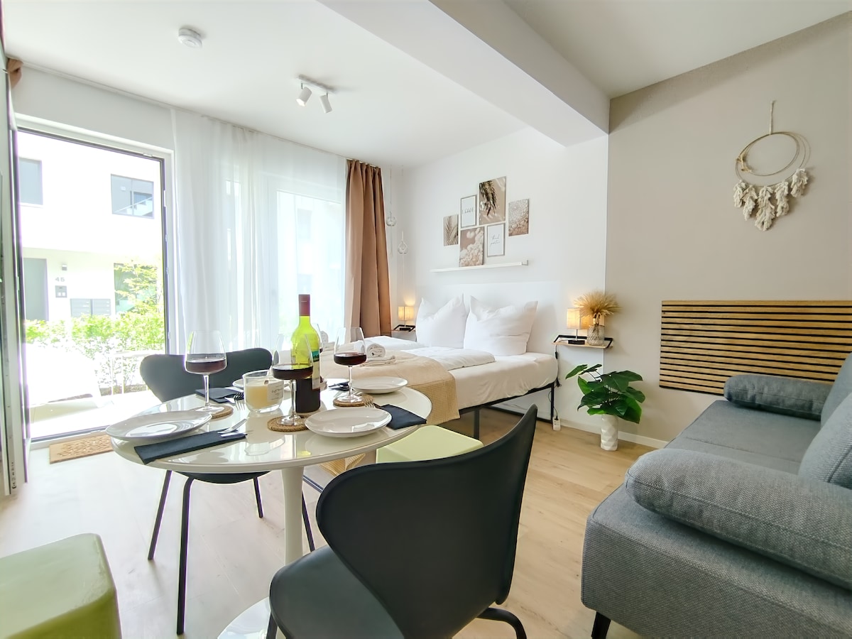 31 m² studio apartman sa terasom ♥ Bračni krevet (širine 150-179 cm) i visokokvalitetna sofa za 2 dodatna gosta ♥ Terasa s prostorom za sjedenje i privatnim roštiljem ♥ Moderna, potpuno opremljena kuhinja, uključujući mikrotalasnu pećnicu i aparat za kafu ♥ Udobna trpezarija za najviše 4 osobe ♥ Smart TV sa Disney+ i brzim Wi-Fi pristupom ♥ Elegantno kupatilo sa XXL tuš-kabinom Dostupni su ♥ dječji krevetac i stolica za hranjenje ♥ Mašina za veš i mašina za sušenje veša u kući za besplatnu upotrebu ♥ Besplatan parking ispred vrata