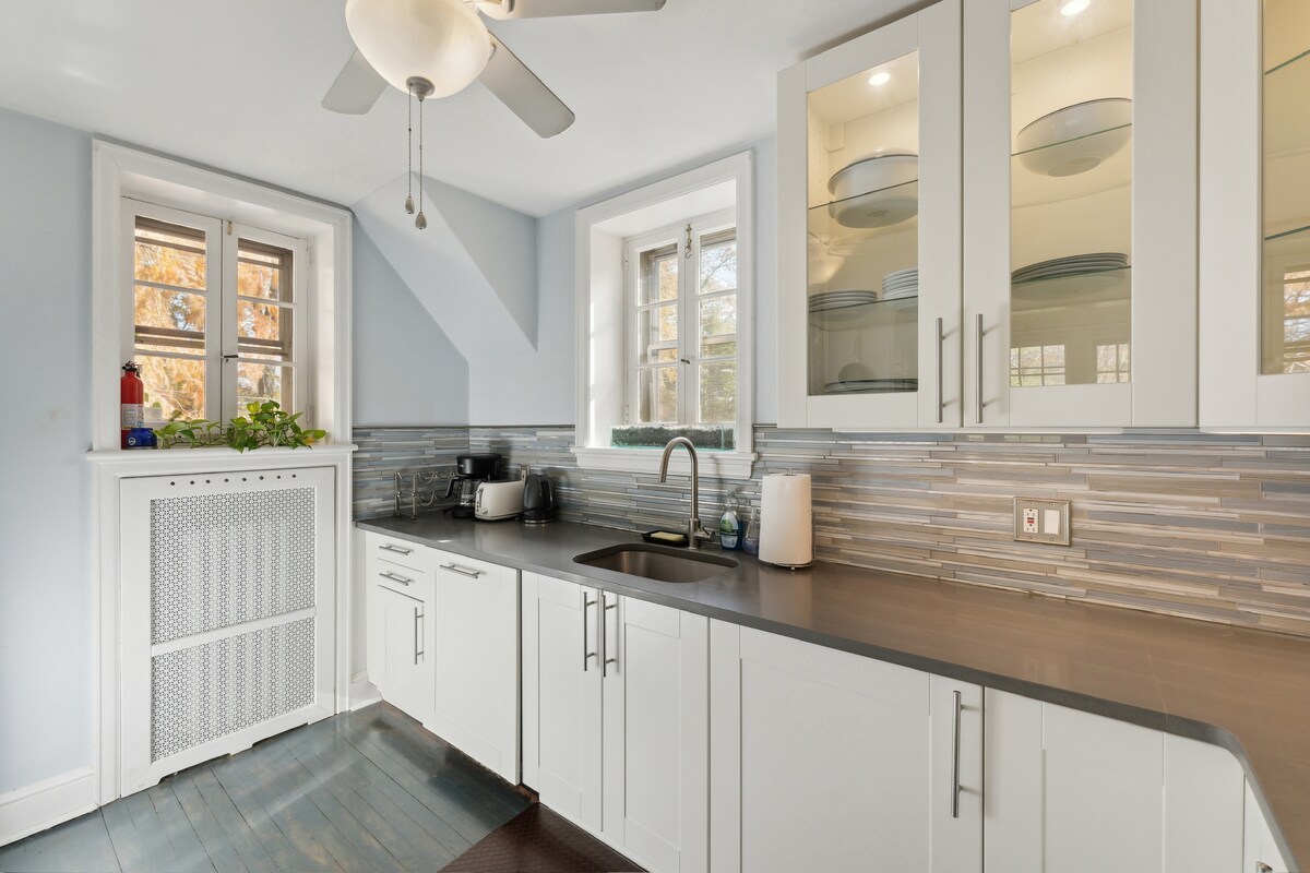 Private Guest Suite attached to our 1813 brick farmhouse on 10 peaceful Bucks County acres. Just 7 miles to Sesame Place, 28 min to the LINC, and minutes to I-95 & the PA Turnpike — perfect base for FIFA World Cup action & fan events in Philly in 2026. Close to Historic Bristol Boro and New Hope. Private 1st-floor entry to kitchen, dining & living with comfy seating & big TV. Upstairs King bedroom with large closet & Neshaminy Creek peek-a-boo. Best for 2 adults + 2 kids; sleeper comfy for kids.