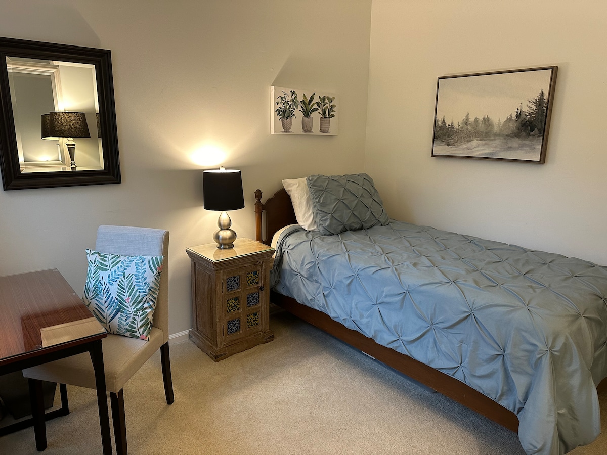 Calm, welcoming space for a woman in my shared home. You’re welcome in all of the common areas; curl up on the couch under a blanket. Relax in the back yard and watch the birds and butterflies. Your room overlooks our backyard garden. Large swimming pool. Lovely, peaceful, safe neighborhood. 15 minutes’ drive to local hospitals and Princeton. Easy access to hiking trails, New York City, and Philadelphia.
