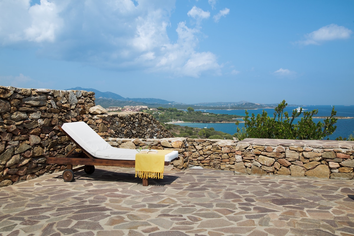 In posizione panoramica splendida porzione di villa bifamiliare, con vista mozzafiato sul mare della Costa Smeralda. Le grandi vetrate danno contiguità tra interno e esterno per godere degli spazi in e outdoor arredati con gusto. Il soggiorno open space ospita anche la cucina attrezzata. Dispone di due camere matrimoniali con bagno. Si distingue con arredi moderni e di carattere