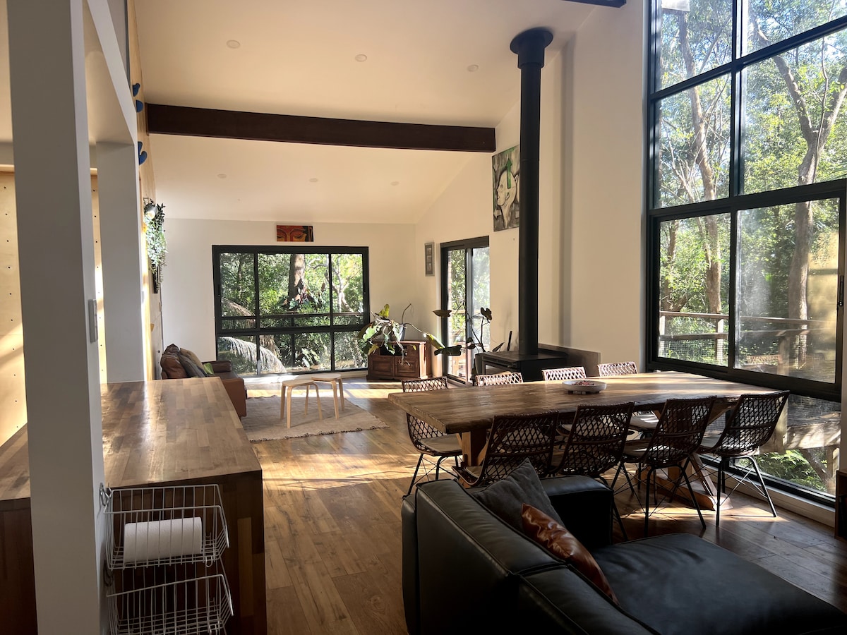 Prostrano samostalno utočište sa privatnim ulazom koji se nalazi odmah pored prašume. Unutrašnjost za opuštanje uključuje drvenu vatru, klima-uređaj i modernu kuhinju sa svim aparatima. Mermerno kupatilo je zapanjujuće. Napolju je divan prostor za ručavanje danju ili noću sa roštiljem na gas. Ekrani za privatnost vas odvajaju od glavne kuće. Uživajte u zvucima prašume, uključujući lirebirds, dok uživate u kafi i doručku na privatnom balkonu.