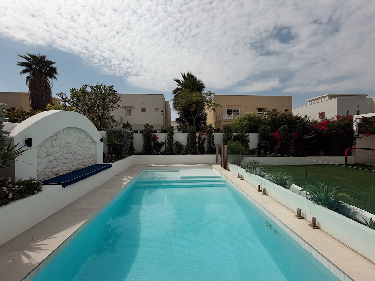 Dobro došli u elegantan dom u stilu vile sa 2 spavaće sobe inspirisan mediteranskim stilom u JVC, Dubai, idealan za opuštene kratkoročne boravke. 🛏️ Može da primi do 5 gostiju (6 ako su dvoje deca) sa dve spavaće sobe, kaučem na razvlačenje i udobnim kutkom. Uživajte u privatnom bazenu, elegantnom enterijeru, besplatnom parkingu, brzom Wi-Fi mrežom, klima-uređaju i potpuno opremljenoj kuhinji. 📍Vrhunska lokacija u blizini hotela FIVE, tržnog centra Circle, kafića, parkova i glavnih puteva u Dubaiju. Čišćenje je dostupno na zahtjev.
