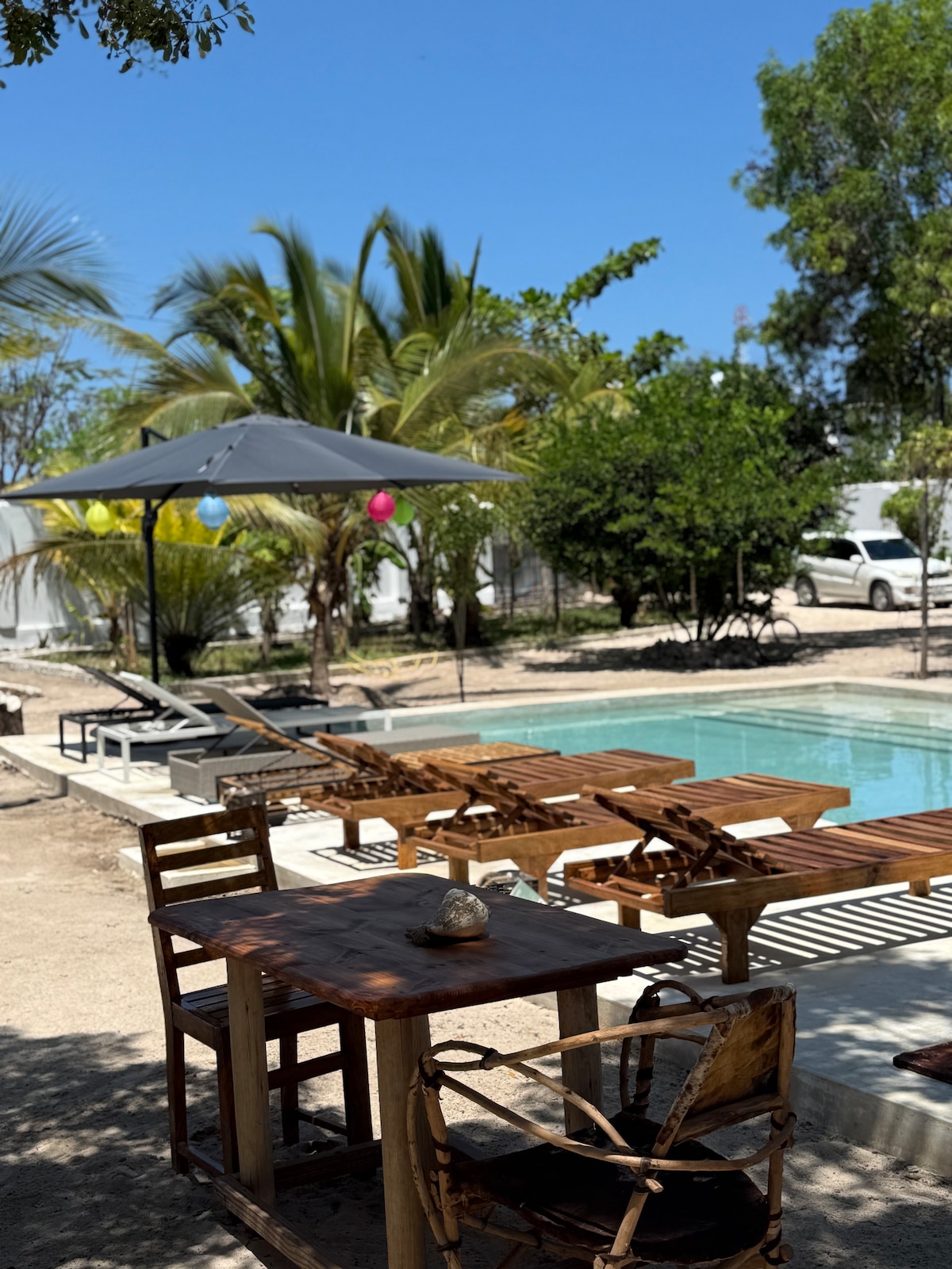 Imamo prelijepu kuću u Bwejuu . Kuća je u prvom redu , imamo privatni bazen . Pored toga, tu su i 3 velika bazena i restoran Kuća je velika: 2 spavaće sobe 2 kupatila 3 toilletes Dnevna soba i kuhinja (Kuhinja je opremljena rernom, frižiderom, posuđem, priborom za jelo, blenderom itd. 2 terase Klima-uređaj Generator ( kada generator radi, imate vodu, svjetlo, frižider, plafonske ventilatore i frižider,Wi-Fi i utičnicu za punjenje) . U kući se nalazi deko u afričkom stilu