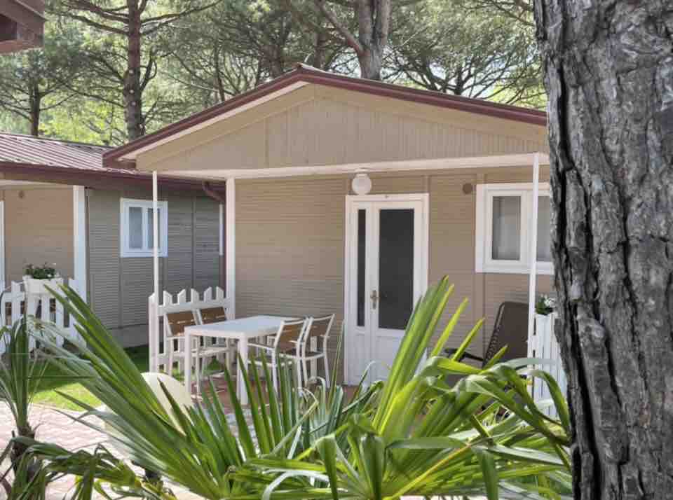 Chalet con 1 camera con ampio letto matrimoniale , bagno con doccia e comoda cucina accessoriata con fornelli, frigo, forno microonde, piatti, pentole, stoviglie, tavolo con sedie Aria condizionata caldo/freddo compresa nel prezzo Terrazza esterna con ulteriore tavolo dove mangiare e sdraio. La casetta si trova in un piccolo villaggio con una piccola piazzetta dove si trovano alimentari pizzeria ristoranti un ampio bazar abbigliamento fruttivendolo e piccola macelleria
