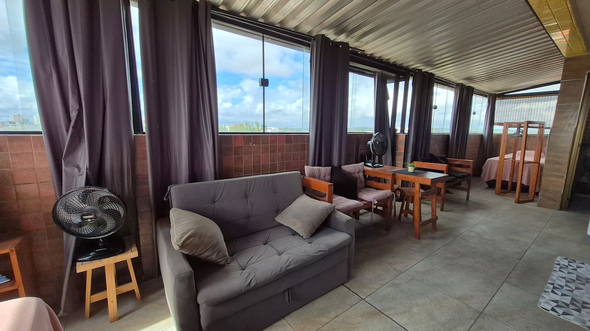 A acomodação oferece colchão e enxoval de ótima qualidade, smart tv 70", ar-condicionado, Wi-Fi, estacionamento rotativo e a praticidade de uma lava e seca a sua disposição. Além disso, uma varanda gourmet para refeições ao ar livre e um lindo terraço com piscina adulto e infantil, com a linda vista para um mar calmo, quente e com trechos de águas claras e esverdeadas. Ideal para banho e prática de esportes náuticos. Sendo uma das praias favoritas de moradores e turistas em João Pessoa.