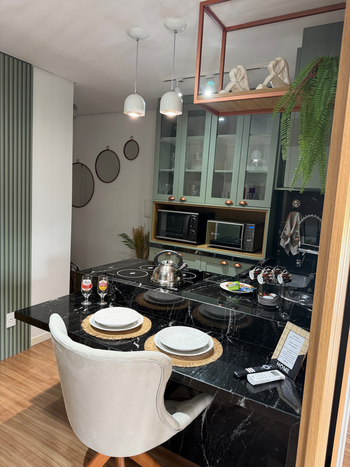 Apartamento novo, super completo, com dois dormitórios, ar cond. nos dois quartos, área de trabalho - Home Office e 1 vaga de garagem de coberta. Localizado em bairro tranquilo e seguro, ótima padaria, quase em frente ao prédio, próximo à supermercados, farmácias, posto de gasolina. Possui cozinha completa, com jarra elétrica, torradeira, cafeteira, liquidificador, microondas, fogão Cooktop 4 bocas, depurador de ar e todos os itens de cozinha necessários. Sacada na sala com linda vista.