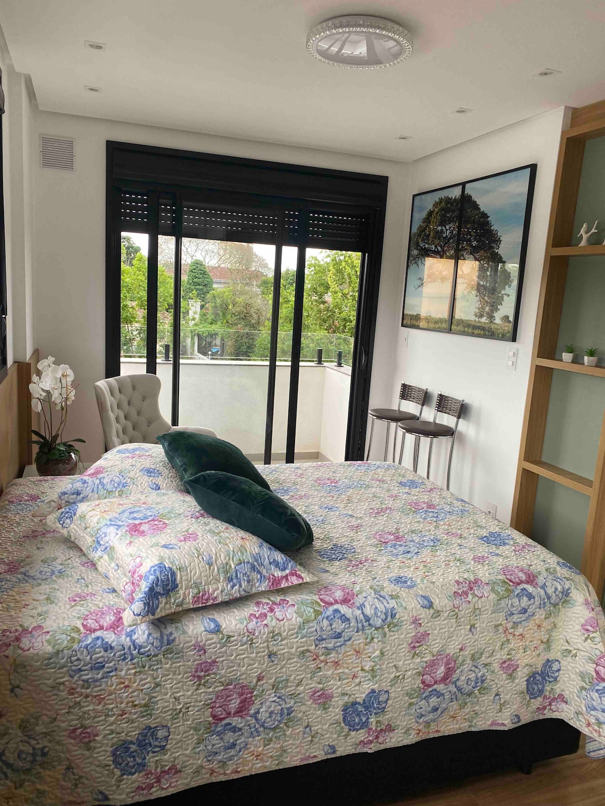 Studio alto padrão no Centro de Cachoeira do Sul. Mobiliário confortável, espaço para home office, cama de casal com auxiliar e box de garagem.