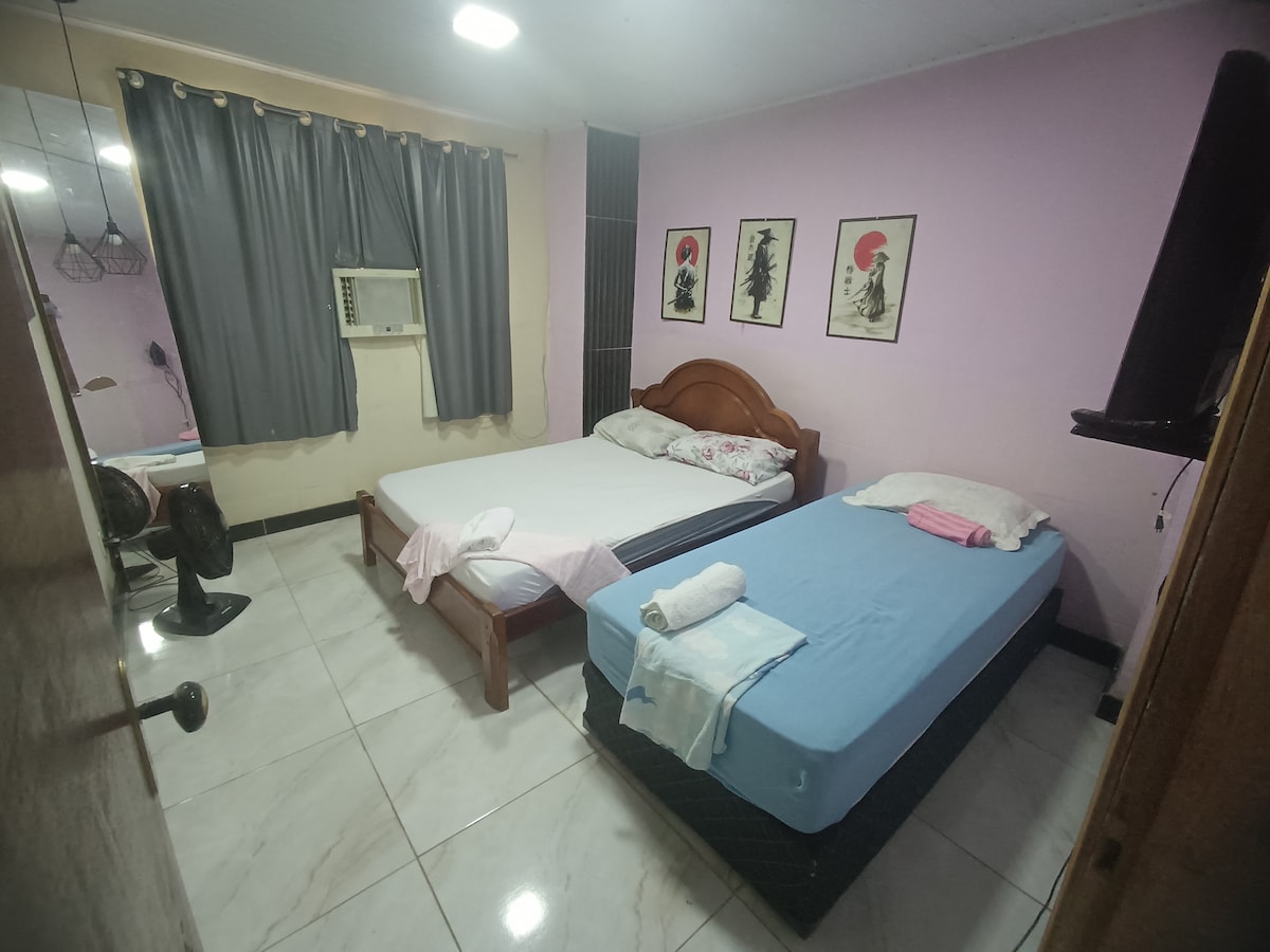 Ar-condicionado aconchegante Roupas de cama, toalhas e sabonete líquido Quinto andar, sem elevador e escada estreita não adequada para pessoas de mobilidade reduzida, grávidas e crianças de colo Estacione na frente do prédio Cama de casal e solteiro Wi-Fi Ar-condicionado Ventilador TV-local Fogão Geladeira Utens. de cozinha Comodidades: 40 a 100m Padaria, Farmácia, Supermercado, Lanchonete e Restaurante Em até 1 km Perim Center Bancos, Aeroporto e Parque de exp. 250m UPA