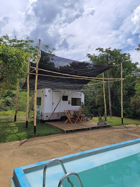 Odsjednite u ekskluzivnoj prikolici u Kakondu - SP! Parkirana na našoj farmi, prikolica ima klima-uređaj, privatno kupatilo, opremljenu kuhinju i dva kreveta, bračni krevet se pretvara u sto sa klupama. Napolju, terasa sa stolom i stolicama, bazen, brana i pristup reci Pardo za ribolov i kupanje. Pored toga, pored prikolice naš salon ima potpuno opremljenu kuhinju, roštilj i kupatila. Idealno za parove ili porodice sa djecom koji traže jedinstvene doživljaje.
