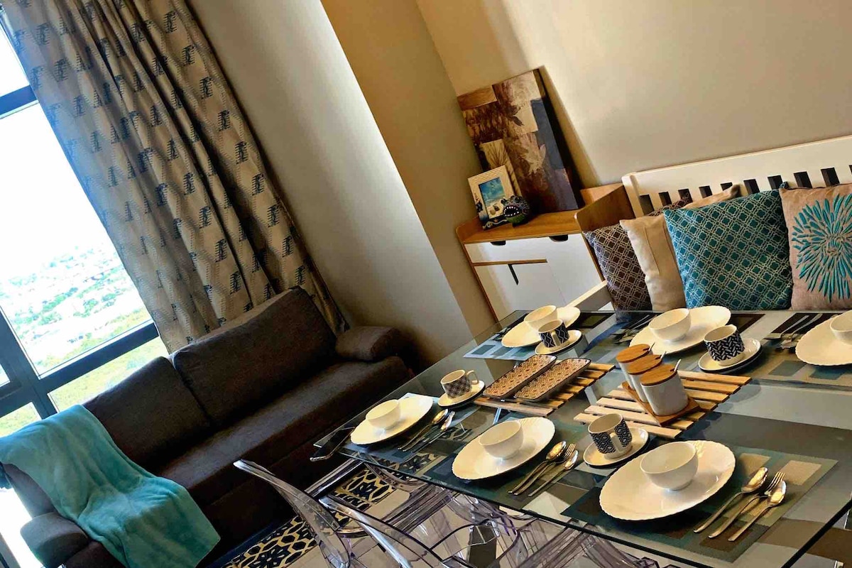Relax with the whole family at this peaceful place to stay. 50sqm 2 bedrooms corner unit, fully Air-conditioned with Internet 150Mbps, enjoy a beautiful view of the Antipolo mountains from the last floor of the building, you can have hot water shower, 60 inches 4k big smart TV, automatic washer and dryer, hot shower, a fully equipped kitchen and high quality beddings.