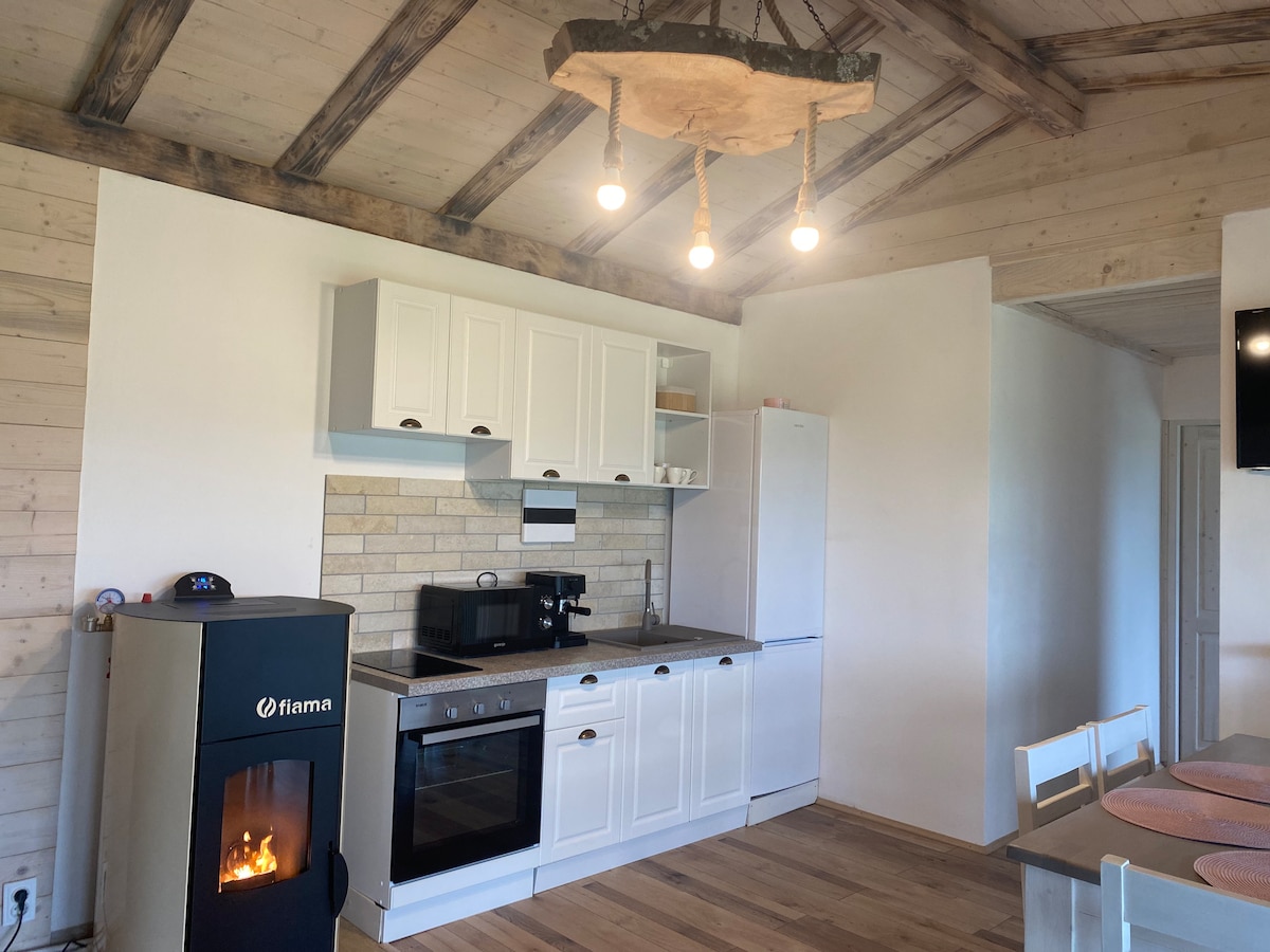 Ovaj jedinstveni dom ima svoj stil. Udobna je,skrovita, okružena je jelom, zemljištem od 6000 m2. Higijenska kada od fiberglasa se priprema samo na zahtev. Unutrašnjost ima jedinstven dizajn sa elegantnim kamenim i drvenim završnim obradama. Kuhinja je opremljena svime što vam treba, ima trpezariju. Kamin upotpunjuje bajkovitu atmosferu. Podno grejanje u smještaju je sa električnom toplotnom pumpom. Optička vlakna WIFI.