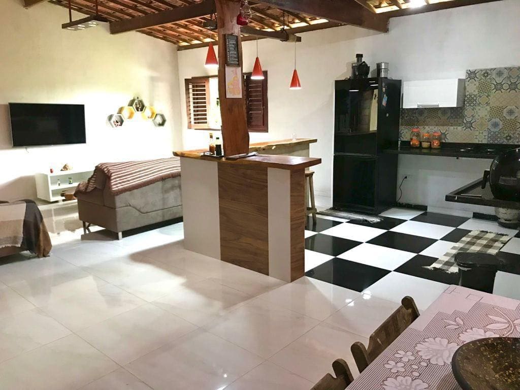 São 2 casas em 1.500 MT. com um total de 6 quartos c/ 3 suítes, sendo 2 quartos com ar condicionado e os demais com ventilador, 10 camas (5 cas/ 5 sol), várias redes na varanda, área verde com fruteiras, espaço para estacionar 15 carros, área gourmet com churrasqueira e alpende arejado, grama com rede de vôlei, 2 piscinas e muita privacidade, ideal para curtir com a família e amigos. Venha se surpreender com um espaço confortável e aconchegante, que vai te deixar com o gostinho de "quero mais".