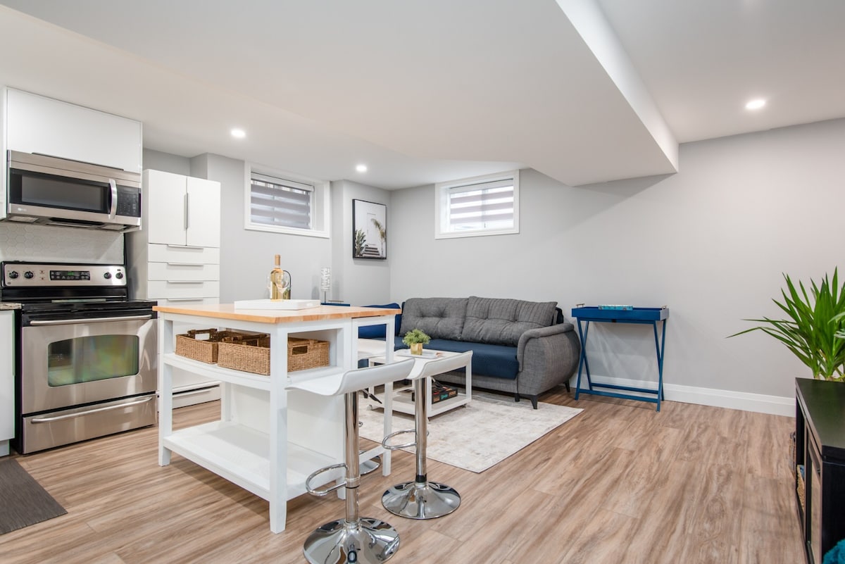 Dozvola br. 25-308528 Moderan 1 bd stan ispod porodične kuće u Gvelf Vest Endu. ~2 minuta vožnje do koledža Konestoga ~5 minuta vožnje do Rec Centra, Costco, Zehrs ~10 minuta vožnje do Univerziteta, centra grada, tržnog centra Stoun Rd ~2 min hoda do autobuske stanice - Besplatan 1 parking 🅿️ na prilazu+ parking na ulici od aprila do decembra Pravi dom daleko od doma: *potpuno opremljena kuhinja i kupatilo *mašina za pranje/sušenje veša *bračni krevet (širine 150-179 cm), 2 kauča na razvlačenje *radni sto Domaćini žive iznad jedinice i dostupni su ako je potrebno, ali vam pružaju i privatnost