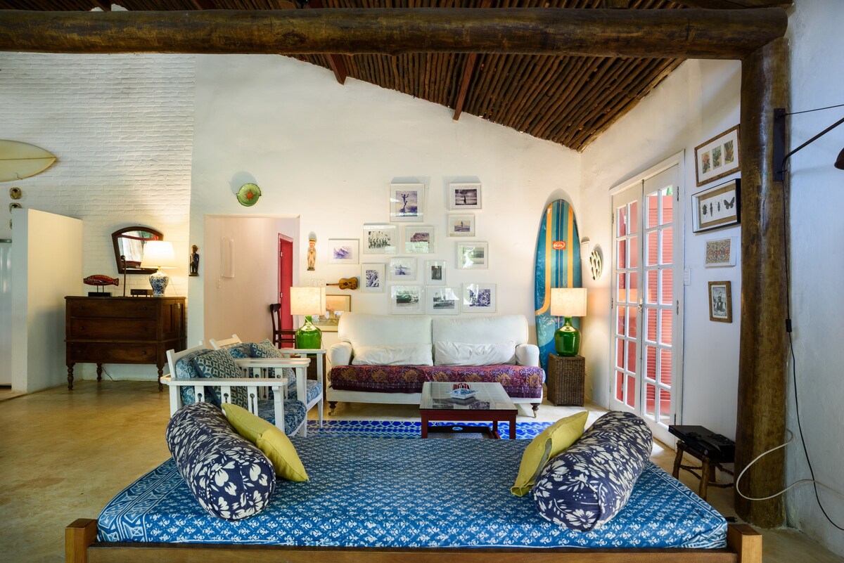 A poucos passos da praia, esta casa tropical cercada por grande jardim é um refúgio perfeito para famílias. Com 4 dormitórios, a casa acomoda até 10 pessoas. Há suíte no térreo, ideal para idosos ou pessoas com mobilidade reduzida. Todos os ambientes têm ar-condicionado, inclusive a cozinha, e a sala conta com lareira aconchegante. Os espaços externos são destaque, com terraço coberto, mesa grande, sofás, redes e churrasqueira, além de jardim tropical iluminado à noite.