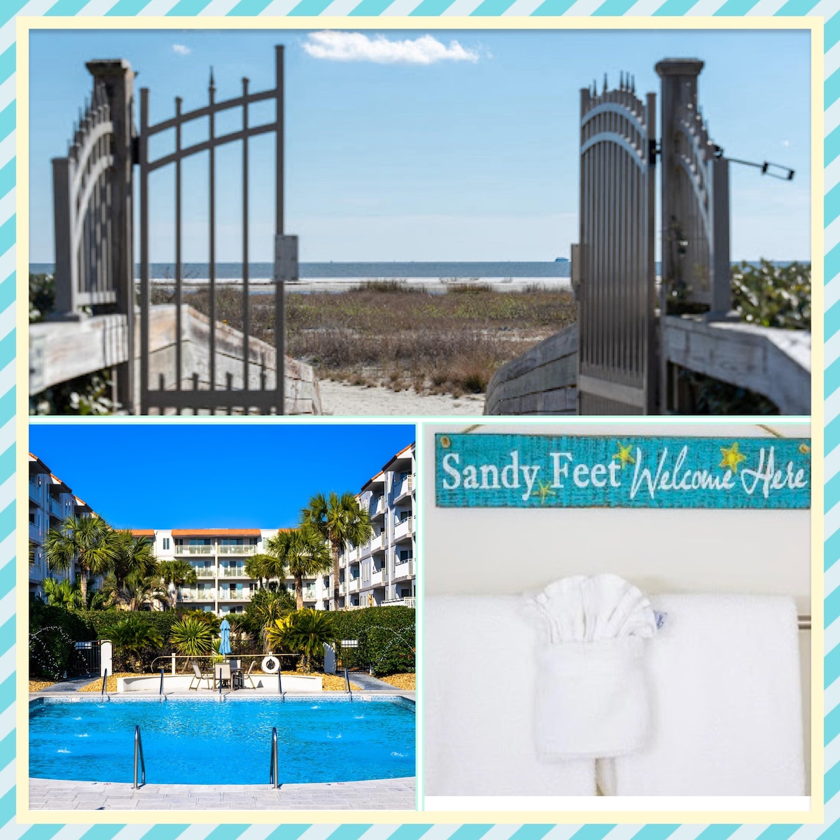 Comfort, relaxation, and beauty await you here - On the quieter and most private side of the Beach Club - with direct, gated beach access . Enjoy our oceanside saltwater pool, 2 hot tubs, and lush gardens - in the perfect spot, on one of the prettiest beaches in the South! Primary suite with king bed, walk-in shower/soaking tub. Second bedroom with 1 queen/ 1 twin, full bathroom. Well-equipped kitchen, full balcony... Come on, the dolphins are waiting for you!