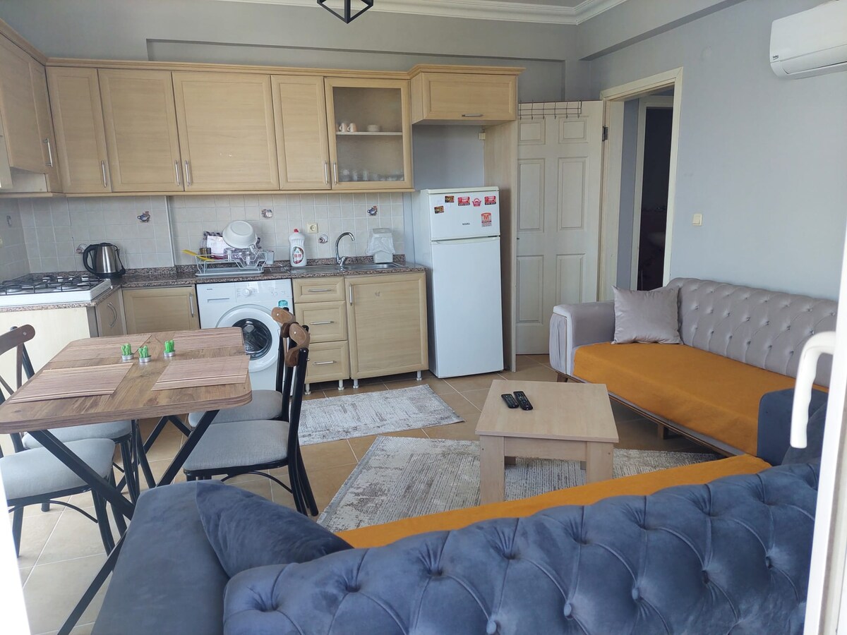 Najvažnija karakteristika našeg stana, koji se nalazi na centralnoj lokaciji Fetija i na trgu Beškaza, najvećem trgu, je jedinstven pogled na more. Naš stan, koji se nalazi u stanu u liftu, ima mnogo opreme koja zadovoljava vaše potrebe, kao što su mašina za pranje veša, mašina za pranje sudova, mikrotalasna rerna, ugrađena rerna, šporet, frižider, fen za kosu, pegla, aparat za čaj. Ima 1 pogled na more i 1 normalnu dvokrevetnu sobu, 1 dnevni boravak (2 osobe mogu da borave) i kupatilo sa toplom vodom 24 sata.
