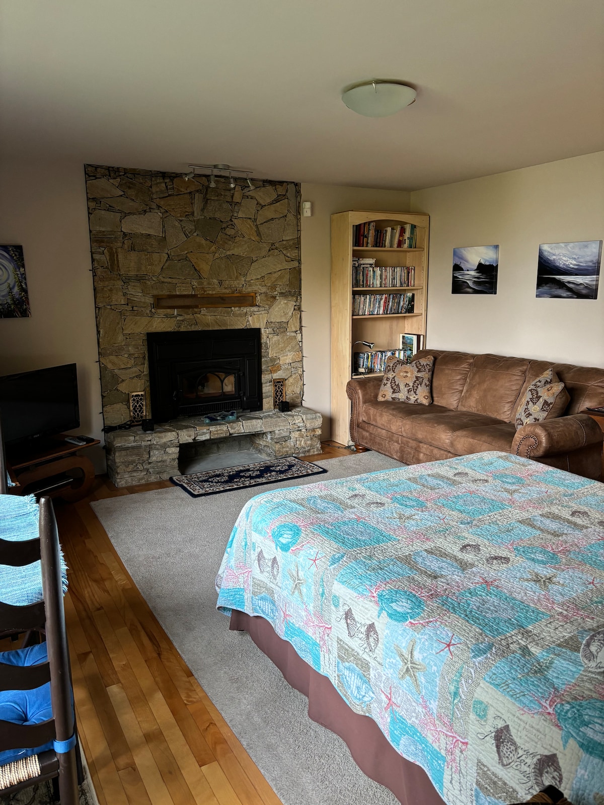 Obala okeana sa zadivljujućim pogledom na planinu Howe Sound/Coastal Mountains (iznad fotografije). U blizini grada, trajekta, restorana. 10 minuta hoda kroz našu šumu vodi do naše plaže za plivanje. Apartman je nedavno renoviran sa kamenim kaminom, bračnim krevetom, novim kaučem na razvlačenje, ulazom bez ključa i privatnom terasom (posteljina i peškiri su obezbijeđeni). Čajna kuhinja ima mikrotalasnu rernu, mali frižider, infracrveni jedan gorionik, dozator vode, aparate za kafu/espreso, posuđe, bez sudopera (mi peremo posuđe za vas). BL#00000625