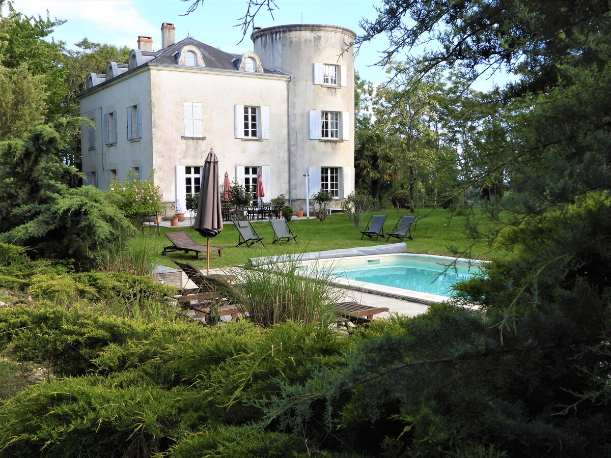 La Comtesse est une demeure de charme située au calme au sommet d'une colline. Originale avec de beaux volumes, ses 6 chambres, dont 3 dans des tours rondes, bénéficient de salles de bain et wc privatifs. Connexion internet haut débit par fibre ; parfait pour télétravail. 3 salons. 1 par niveau. Parc de 2 hectares et piscine chauffée. Sans vis à vis. Piscine chauffée.