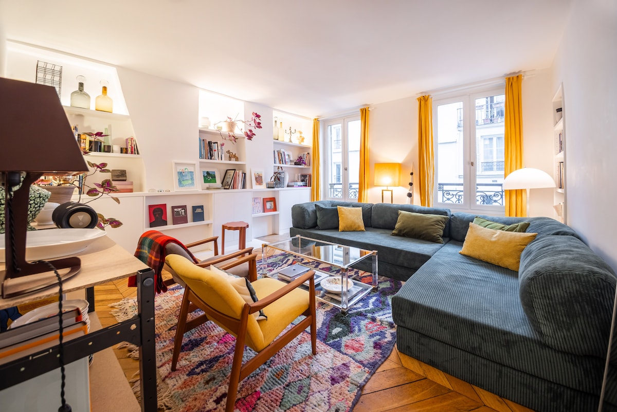 Retka ugaona jedinica, juliet balkoni bacaju svetlo u ovaj dom koji je dizajnirao Chez Jöne. Ukrašena mineralogijom i biljkama, možete da osjetite pozitivnu energiju čim uđete. Velikodušna spavaća soba ima visoke prozore i klasični pariski drveni pod od riblje kosti. 34 m² / 366 ft². Izjava O ODRICANJU OD ODGOVORNOSTI: 3. francuski sprat, bez LIFTA. Moj pas boravi ovdje kada i ja. Ovo je za podizanje svijesti o alergijama - ona neće biti ovdje tokom vašeg boravka.
