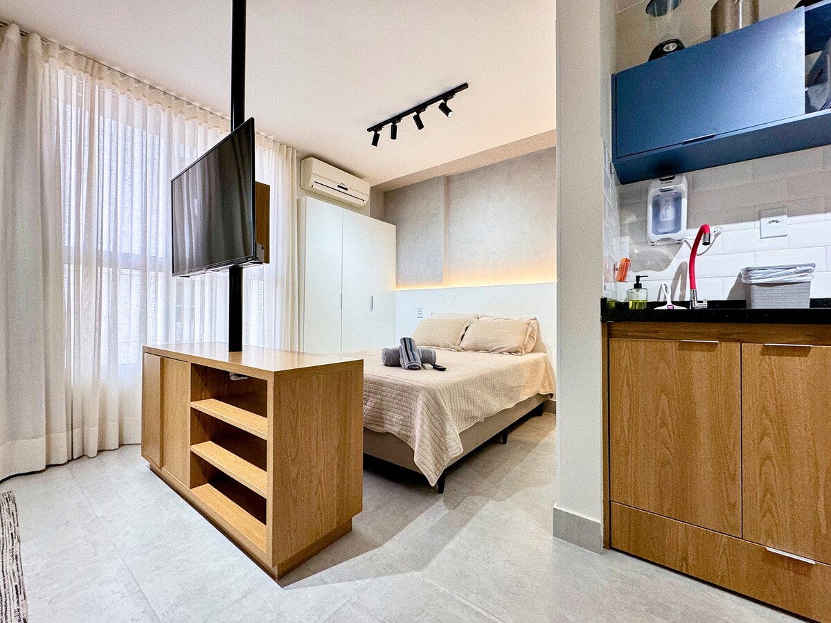MAIS BEM AVALIADO FLAT BRASÍLIA 🗺️ Bairro Nobre ✈️ 15 min. do aeroporto 🛒 Ao lado do Supermercado 24h 🇺🇸 18 min. do consultado americano CASV 🛜 ⚡️Wi-Fi ❄️Ar cond. 🎥TV Smart 👨🏻‍🍳Fogao, Geladeira, Microondas e utensílios (Não temos filtro) 🅿️ Garagem privada a parte 🛁 Chuveiro, Toalha, sabonete, shampoo e condicionador. :. ÁREA COMUNS: 👙😎🩲 Piscinas, academia, Sauna, Jacuzzi (fechado às segundas) :. PROXIMIDADES A PÉ: Ⓜ️5 min Metrô 🛍️ 5 Principal shopping de Brasília