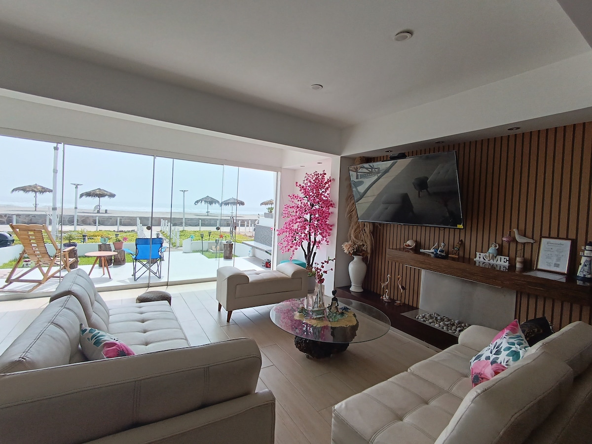 🌊 Hermosa casa en primera fila frente al mar, con acceso directo a la playa y una vista espectacular. Ideal para vacacionar en pareja, familia o con amigos. Cuenta con 5 habitaciones, 4 baños completos, piscina privada, zona de parrilla, horno de barro e internet Starlink. Excelente ubicación: a 5 minutos del muelle de Cerro Azul y restaurantes (caminando por la arena a 20 minutos), a 15 minutos de Asia y a 1 hora de Lunahuaná. Espacios amplios y perfectos para el descanso y la convivencia.