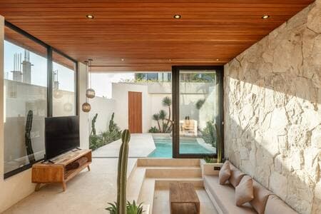 Playa 12 Canggu Villa je potpuno nova, moderna dizajnerska vila koja se nalazi u srcu Čanggua. Ova prelijepa i udobna vila savršeno se nalazi samo nekoliko minuta od svjetski poznate plaže Čanggu i kluba Finn's Beach, samo 1 minut hoda od restorana Avocado Factory i savršena je za vrhunski odmor na Baliju za porodicu! - Otvorena ili zatvorena dnevna soba - Snažan Wi-Fi - Potpuno opremljena kuhinja - Vlastita privatna bašta i bazen - 2 spavaće sobe na spratu, svaka sa spojenim kupatilima