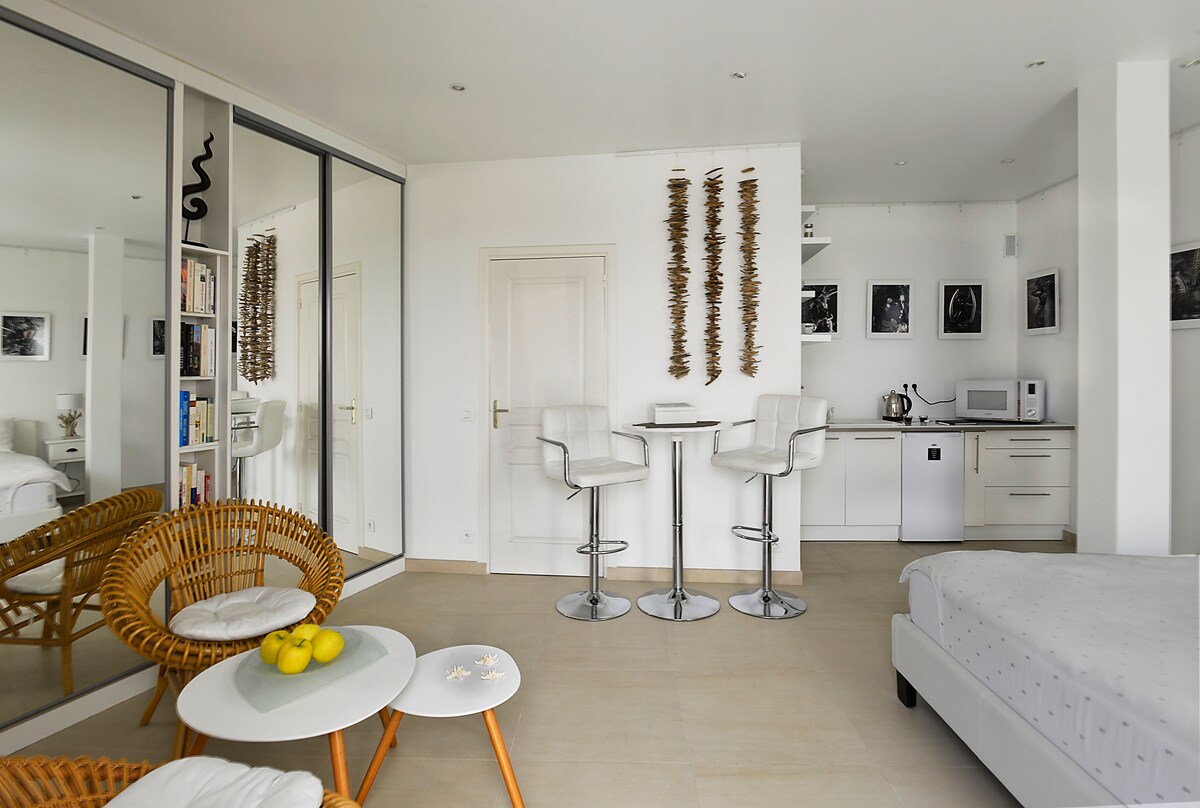 Studio indépendant 20m2, dans maison familiale, avec petit jardin et place de parking. idéalement situé entre Cannes et Monaco. Toute commodité, petit salon de jardin avec plancha à disposition. Possibilité 4 couchages (lit 2 places sur mezzanine + 1 canapé-lit) mais ideal pour 2 pers ou avec des enfants. Salle de bain avec baignoire, cuisine équipée, rangements et penderie. Appartement climatisé avec télé connectée avec Netflix et Disney + (pas de câble TV), internet WIFI, jeux pour enfants.
