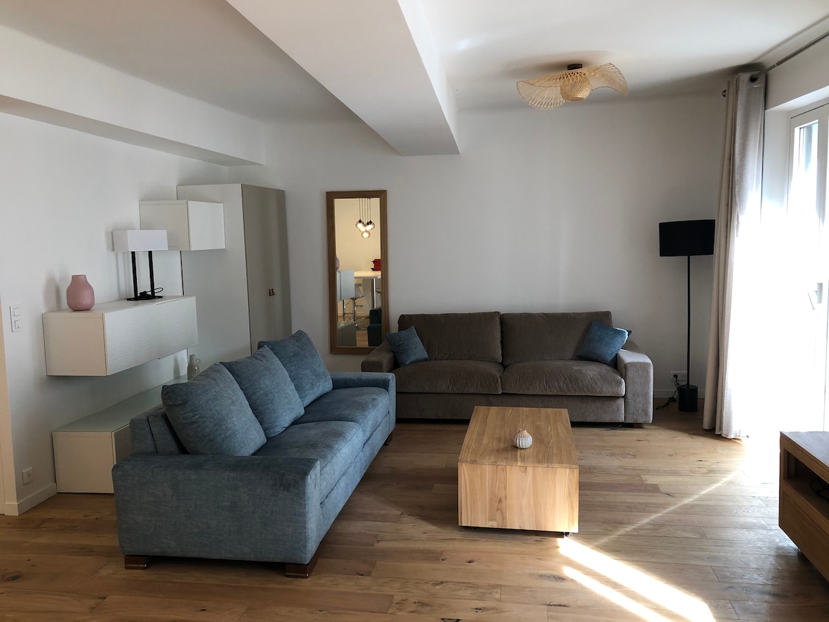 Discover this beautiful, newly renovated architect-designed apartment in the heart of Cannes. Located on the 1st floor, without elevator, this apartment includes a large living room, 2 adjoining bedrooms with independent entrance, a fully equipped kitchen, a shower room, a bathroom and a laundry room. Located at 6-minute walk from the Palais des Festivals and 7 minutes from the train station, this apartment will allow you to enjoy the joys and sunshine of Cannes while making your travel easier.