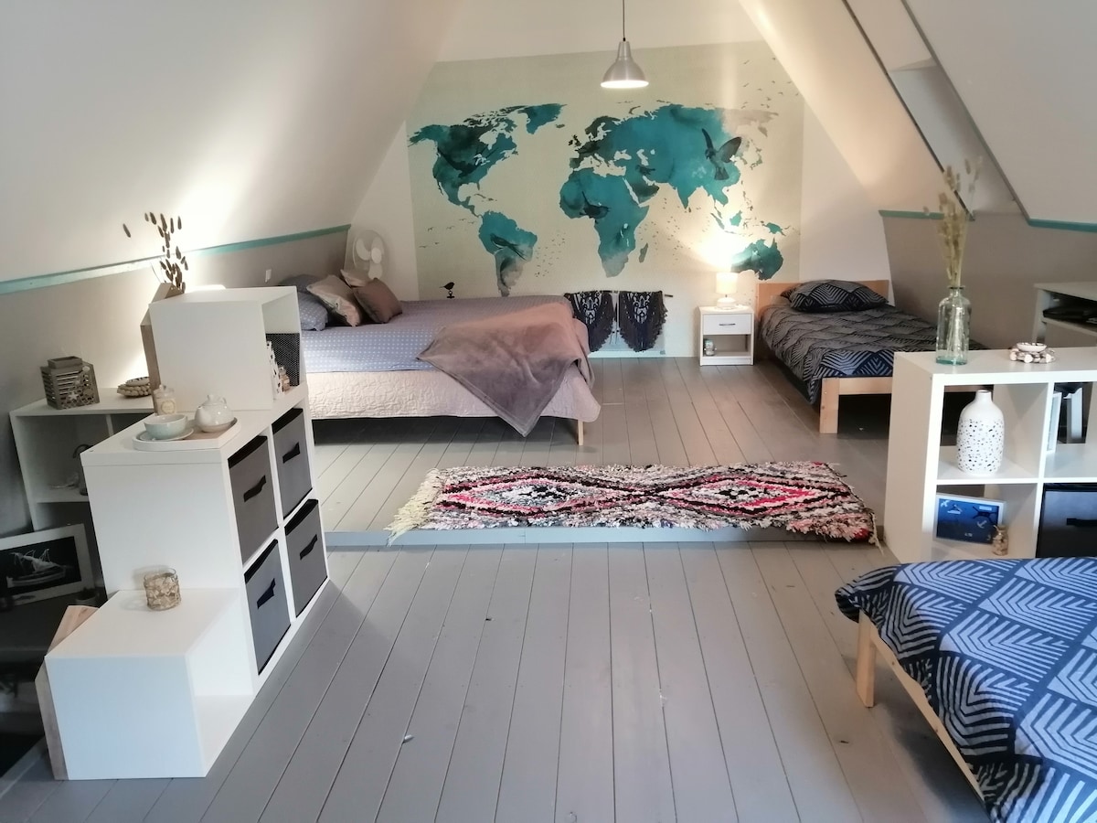Spavaće sobe sa 4 kreveta za jednu osobu u smještaju koji se nalazi na podu velike kuće sa tuš kabinom i WC šoljom koju dijele obje spavaće sobe za iznajmljivanje. Nalazi se na kraju malog dijela koji nije zanemaren i možete tiho da usisavate. Dostupni su frižider i mikrotalasna pećnica za doručak (5 eura). Direktan pristup pješačenju stazama imaginarnog. U blizini (-5 km): Konjički ranč Srednjovjekovni grad Espace balnéo Sentier de l 'imaginaire Marché Superette