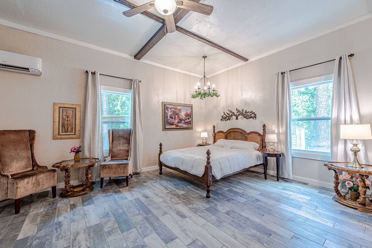 Renovirani apartman Master Bedroom sa zidovima, hidromasažnom kadom i WC šoljom sa bideom. Veoma je spa i savršen za samce ili parove koji žele da pobegnu. Lako se stiže peške do plaže, pijace i koncerata na otvorenom. Udaljenost peške do restorana. Vaša soba ima sopstveni ulaz na drugom spratu. Velika natkrivena veranda je takođe vaša! Imamo Roku TV. Novi nameštaj za spavaću sobu i dušek sa podesivim krevetom. Nije opremljeno za bezbednost dece.