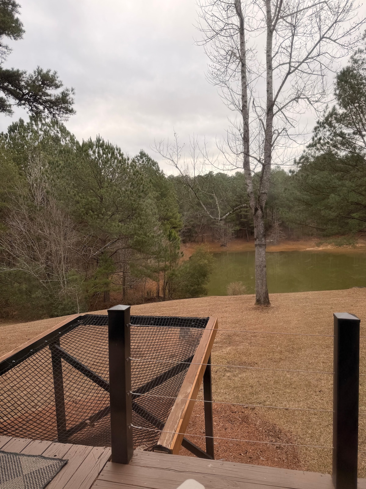Enjoy the rocking chair porch in the foothills of the Warrior Mountains with a treehouse view of bird habitat in every direction. Private ... no other houses in sight. Hand built construction by Mark who felled each tree from our own land and built this cabin literally with his own two hands. The wrap around deck we call "Sally's Deck". Hurricane Sally provided the wood when she deposited a pile of docks on our Ft Morgan property. The natural wood interior is lovely! One of a kind!