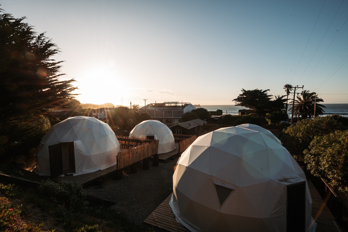 Bienvenidos a Domos de Matanzas. La combinación perfecta entre la comodidad y lujo de un hotel, con el placer de acampar. Todo diseñado para tener una EXPERIENCIA ÚNICA con hermosas VISTAS AL MAR y tu propia tinaja privada y de uso libre. La ubicación es ideal: Segunda Linea frente al mar en pleno centro de Matanzas, a pasos de la playa, supermercados y restaurantes . Maravillosos para estacionar tu auto hasta el fin de la estadía.
