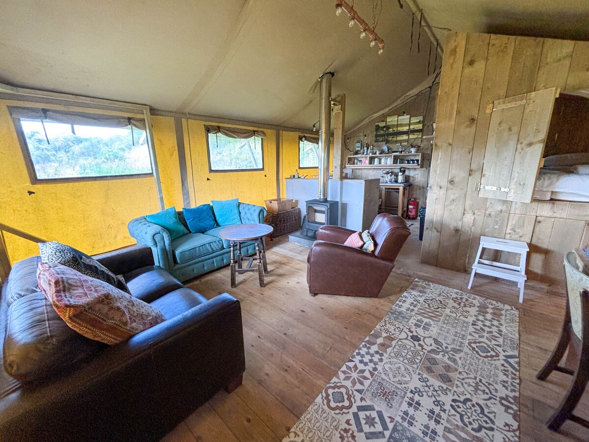 A beautiful 6 person safari lodge nestled in the wild fields of Golden Grove Retreat, South Wales. A truly special location abounding with wildlife and natural beauty adjacent to an organic farm. We are catering for people who want to relax and unwind whilst connecting with nature. The tent is equipped with a kitchen, living room, dining area, 3 bedrooms, wood-burning stove and outside gasfired shower and compost toilet. Guests also have shared access to a wood-fired sauna and plunge pool.